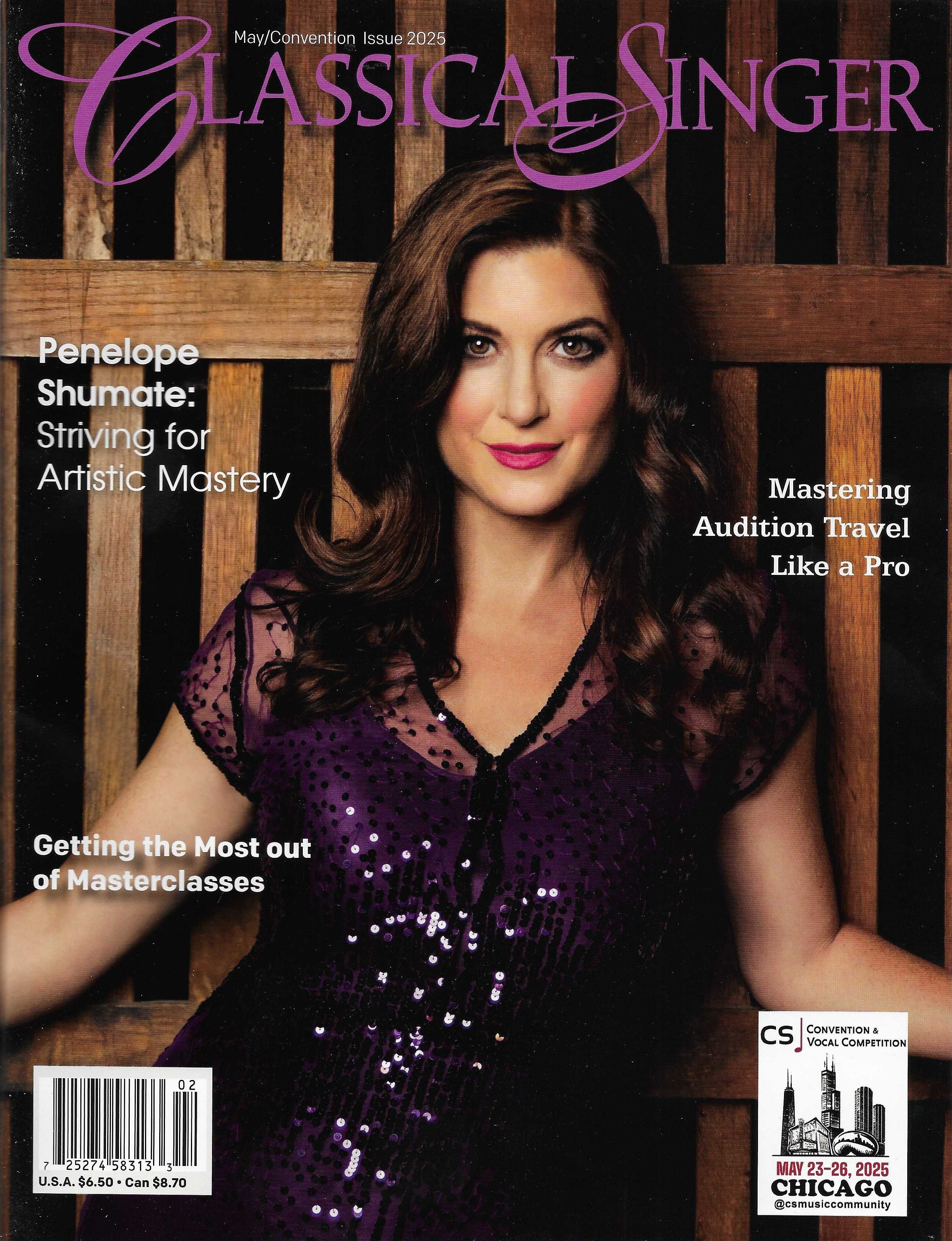 She is featured in the May 2025 issue of Classical Singer Magazine detailing her versatility as a performer and teacher of classical as well as contemporary commercial music vocal genres such as musical theatre and jazz. At the Classical Singer national convention in Chicago, she served as a presenter, Masterclass clinician and judge. She has performed internationally and throughout the US including appearances with Opera Company of Philadelphia, Opera Roanoke, Des Moines Metro Opera, Utah Festival Opera, Annapolis Opera, Opéra Louisiane, Opera on the James, Muddy River Opera Company, Waynesboro Symphony Orchestra, Santa Fe Symphony Orchestra, Alabama Symphony Orchestra, Oklahoma Philharmonic, Lansing Symphony Orchestra, Gulf Coast Symphony Orchestra, Hilton Head Symphony Orchestra, Heartland Festival Orchestra, Paducah Symphony Orchestra, Gateway Chamber Orchestra, Rapides Symphony Orchestra, Shenandoah Valley Bach Festival, Distinguished Concerts International New York, Berkshire Choral Festival, Chamber Orchestra of Philadelphia, and the Kennett Symphony Orchestra, among many others.